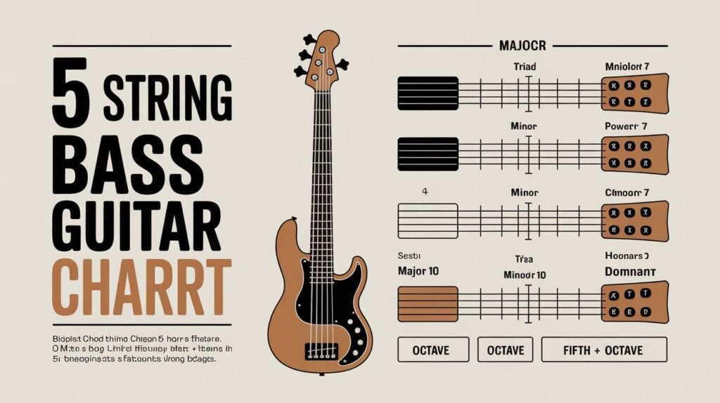 This guide includes an easy-to-read 5 string bass guitar chords chart, beginner-friendly diagrams, and movable shapes you can use across the entire fretboard.