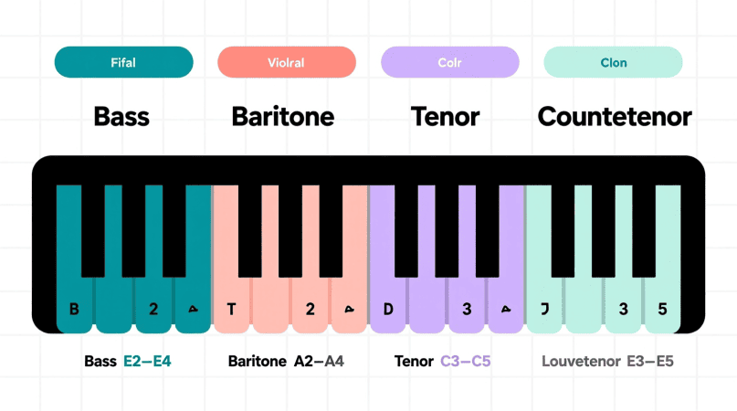 Male voices are grouped into four primary categories based on pitch, tone, and vocal weight. Here are the typical ranges for each voice type: