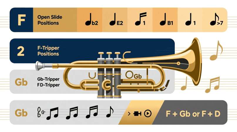 The F-trigger reduces slide movement and improves intonation options in the low and mid registers.