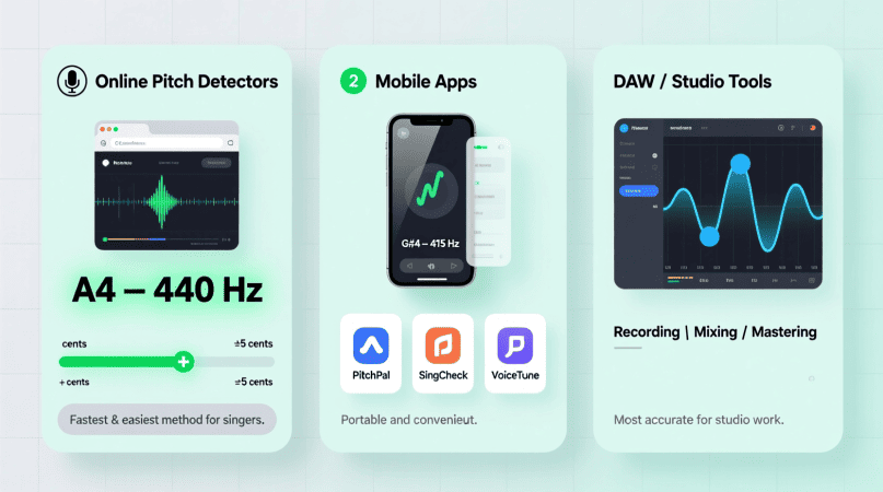 You can detect the pitch of your voice with free online pitch detectors, mobile apps, or music software that analyze your microphone input and show you the closest musical note in real time.