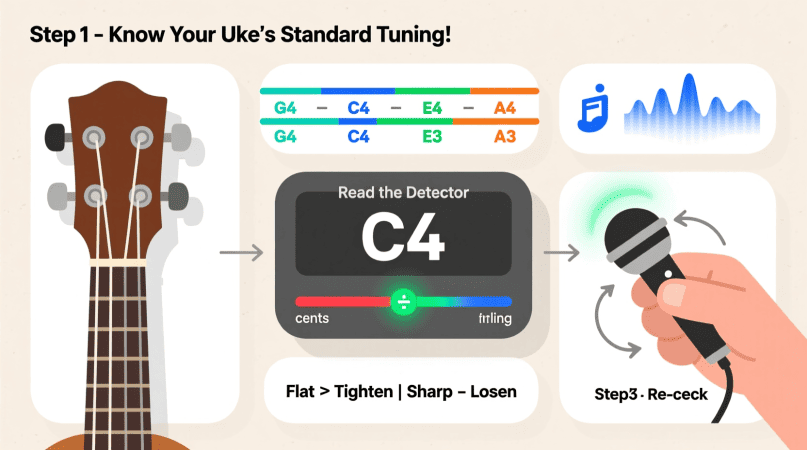 If your ukulele sounds a little “off,” even after you’ve tuned it, you’re not alone. The ukulele’s small size makes it sensitive to changes in temperature, string stretch, and even how hard you strum. Traditional tuners work well, but using a pitch detector gives you instant visual confirmation of whether your string is sharp, flat, or locked right in.