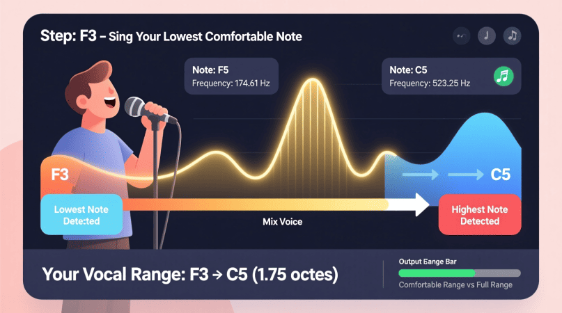 A pitch detector shows you the lowest and highest notes you can sing. That span defines your vocal range. It can also hint at your voice type, highlight where your voice feels comfortable, and track changes over time.