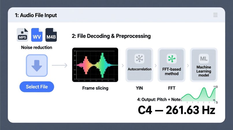 An Audio-File Pitch Detector is a browser-based tool that analyzes pitch in recorded audio files rather than live input. It tells you: