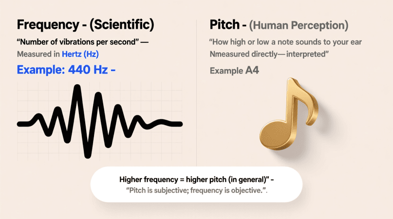 The difference between pitch and frequency is simple: frequency is science, pitch is perception. Frequency tells us how fast sound waves vibrate, while pitch tells us how we interpret those vibrations as music.